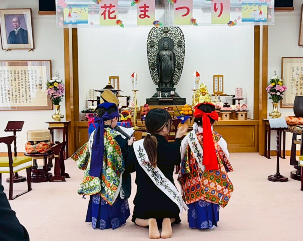 稚児讃嘆文奏上はO家のHさん、Rさんがお母さんに付き添われながら、一所懸命にお釈迦様の誕生物語とその意義を述べてくれました。ほとんど言葉につまることなく、事前に相当練習されたことが伺え、参拝者は温かい気持ちになりました。
